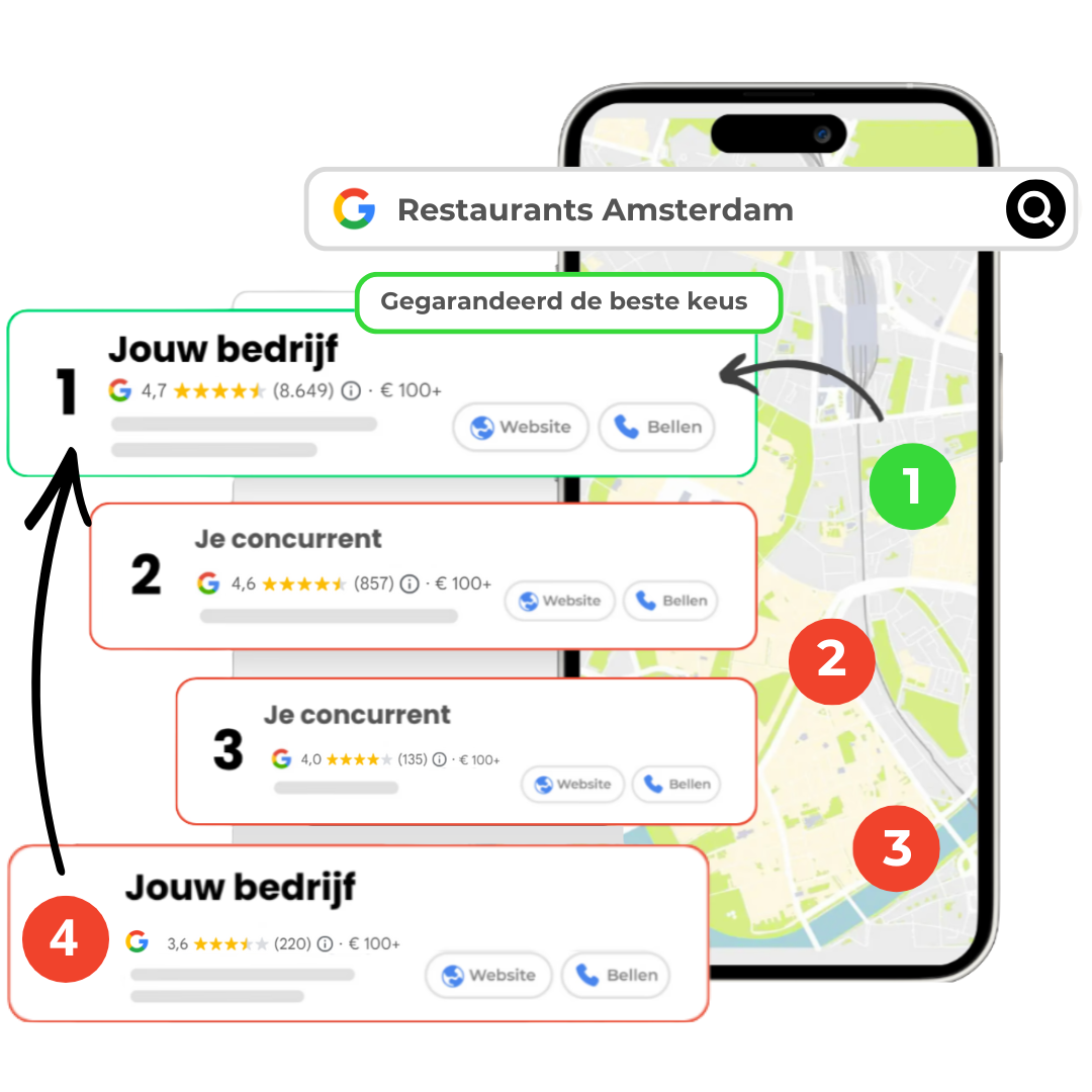 Zoekmachines kijken niet alleen naar je website, maar ook naar hoe actief en betrouwbaar je bedrijf online is. Meer reviews, vaker nieuwe reviews en hogere waarderingen zorgen ervoor dat je beter zichtbaar wordt in zoekresultaten.