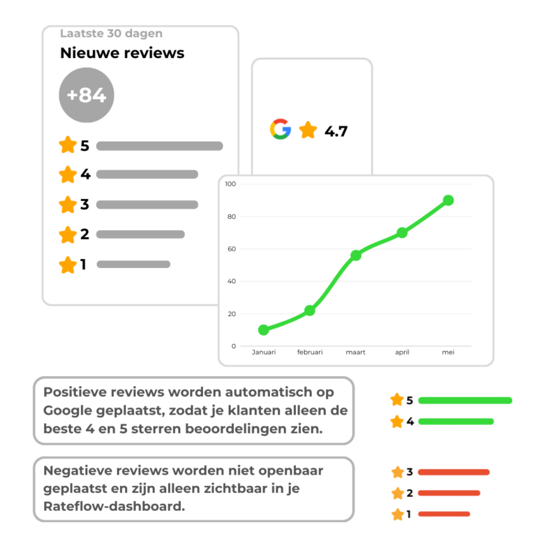 Rateflow helpt bedrijven om structureel meer online reviews te verzamelen en beter zichtbaar te worden. Niet alleen op Google, maar ook op andere reviewplatforms die belangrijk zijn binnen jouw branche.